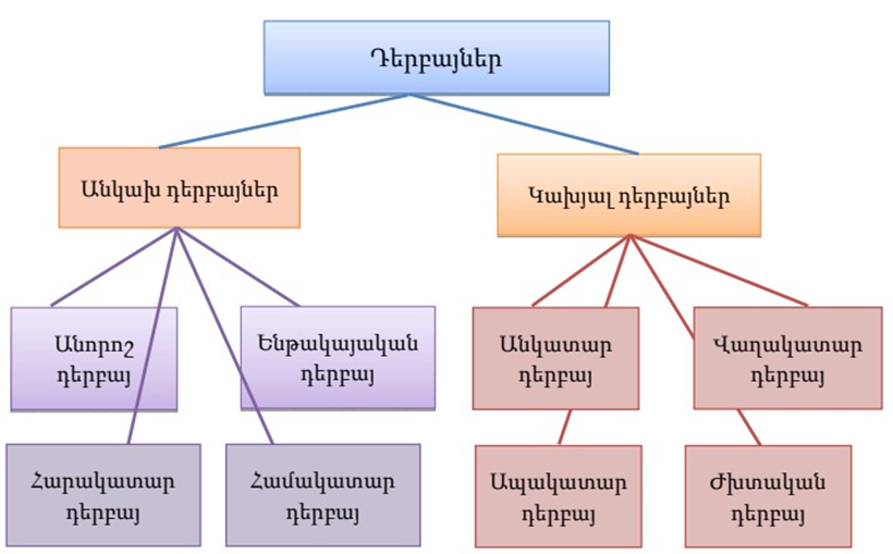 2. Ինքնուրույն շարահյուսական կիրառություն ունեցող, հետեւաբար բառային անկախություն ունեցող դերբայներ, դրանք են՝ անորոշ, ենթակայական, հարակատար, համակատար, կատարելի II (կարդալիք):